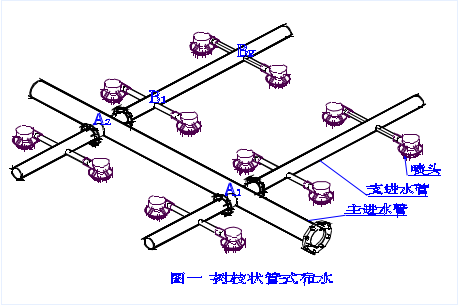 逆流冷卻塔循環水系統的布水方式采用管式布水,呈樹枝狀,循環水先進入主管,然后進入支管,再進入噴頭,主管、支管、噴頭相互垂直,如圖一。根據流體狀態方程:壓力(P×流速(V)=常數(K),循環水從主管流經A1點、A2點后,到達主管末端,由于冷卻塔布水需要主管末端是封閉的,因此流速(V)急劇下降,壓力(P)急劇上升,所以A2處比A1處水壓頭大,同理B2處比B1處水壓頭大,綜上分析各布水噴頭處的水壓頭不相