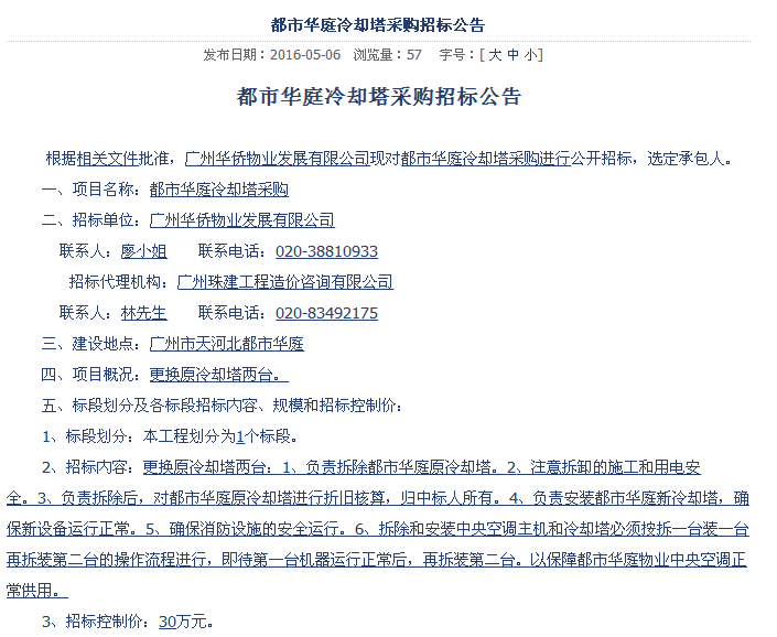 第三方網上公開冷卻塔招標信息: