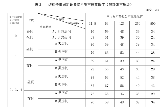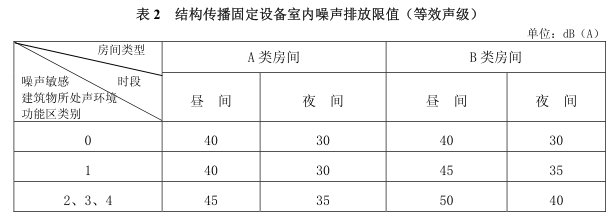 當(dāng)固定設(shè)備排放的噪聲通過建筑物結(jié)構(gòu)傳播至噪聲敏感建筑物室內(nèi)時(shí),噪聲敏感建筑物室內(nèi)等效聲級(jí)不得超過表 2 和表 3 規(guī)定的限值。