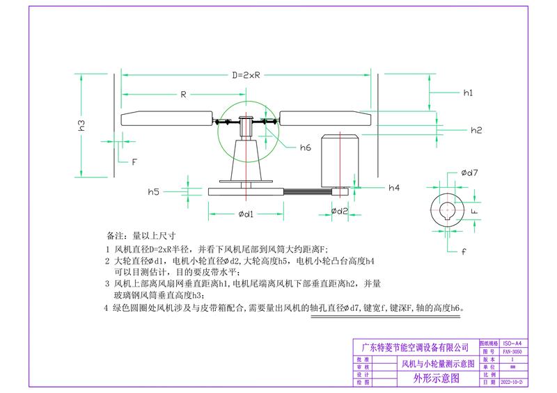 4、綠色圓圈處風機涉及與皮帶箱配合,需要量出風機的軸孔直徑必d7,鍵寬f,鍵深F,軸的高度h6 。